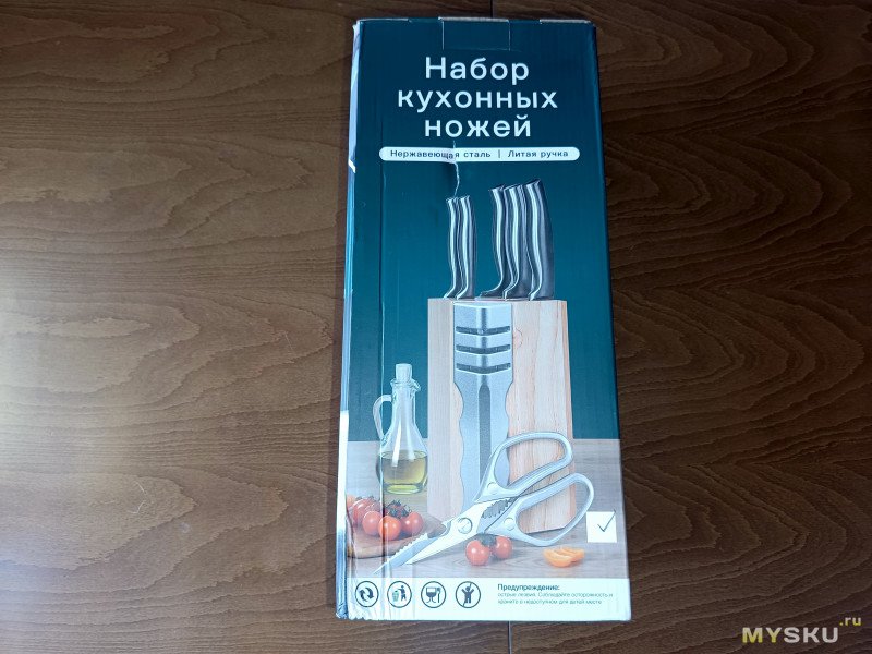 Комплект ножей поставляется в типичной картонной упаковке с цветным принтом. Названия модели или бренда здесь нет, они так и называются «Набор кухонных ножей».