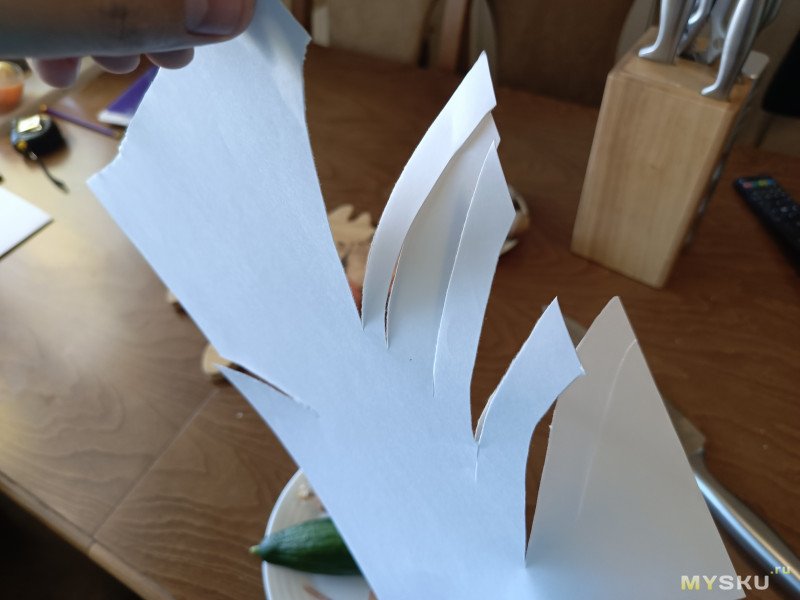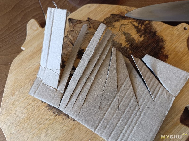 Тесты с бумагой и картоном ножи проходят уверенно. В левой руке лист бумаги, и без особого усилия режу правой рукой. Плотный картон на кухонной дощечке также режется как нож по маслу. Конечно, сколько ножи будут так резать, неизвестно, но в целом есть ножеточка, которой можно и подточить, и наточить. Поэтому для обычного домашнего использования сгодится.