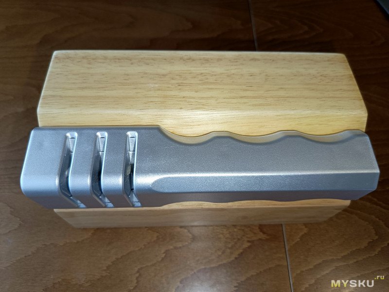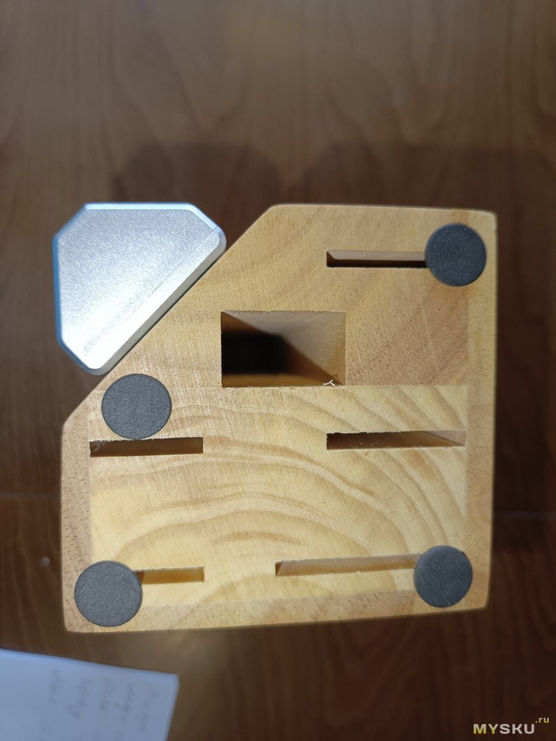 Подставка клееная из кусочков бука, это видно снизу и сверху. В целом типичная подставка с резиновыми накладками снизу, за исключением здесь идет съемная ножеточка с тремя степенями. Ножеточку испробовал на старых ножах и скажу, что со своей задачей справляется. В руке держать удобно из-за своего размера и углублениям под пальцы. Также плюс, что она металлическая, походу сделана из алюминия.