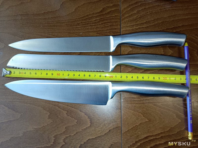 Для начала я хочу показать размеры ножей. Все три больших ножа практически одинаковой длины. У двух длина 34 см, а у хлебного — 33 см. Разницы в один сантиметр в целом незаметно. У всех трех этих ножей одинаковая рукоять в 14 см.