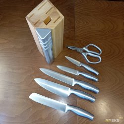 Кухонные ножи — незаменимый атрибут любой кухни. В этом обзоре я хочу рассказать о доступном комплекте цельных ножей из нержавеющей стали. К ним прилагается подставка из бука и удобные ножницы.