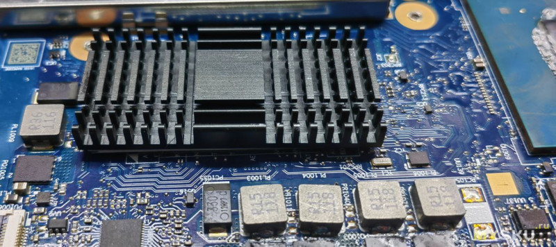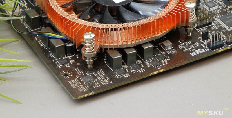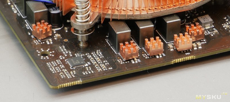 Еще с тестов видеокарт я заметил интересную особенность: даже бюджетные фазы питания могут рассеивать до 25W под обдувом, но если прикрепить хоть какой-нибудь радиатор, то эффективность повышается до 40W. Здесь я решил прибегнуть к подобному принципу, а так как площадь мосфетов маленькая, разбросаны они по плате, а по краям мешаются высокие резисторы, то и искать надо было крохотные радиаторы.