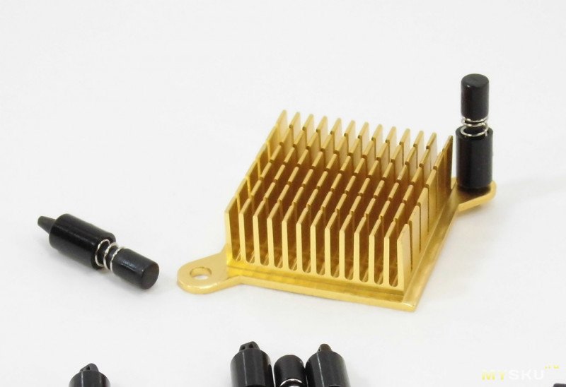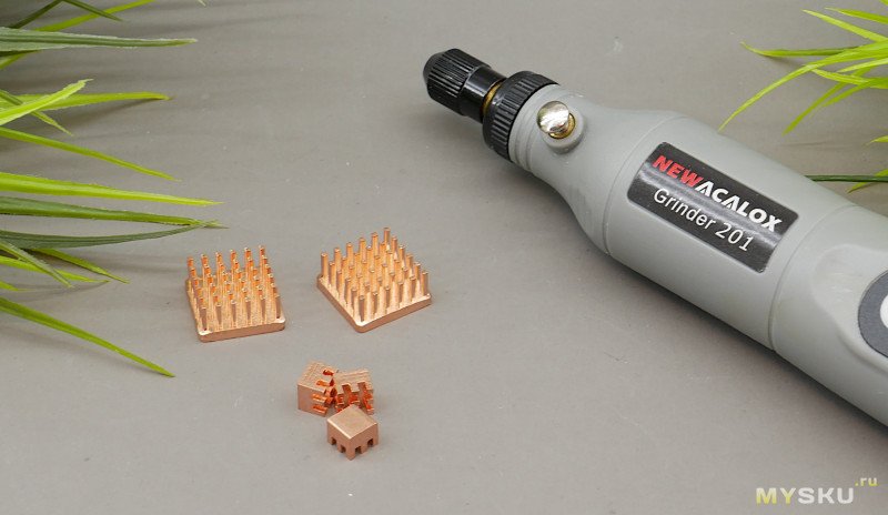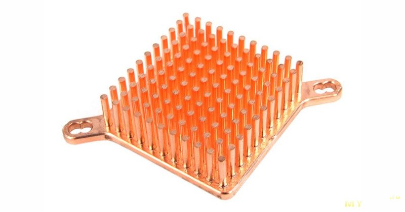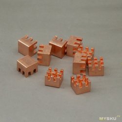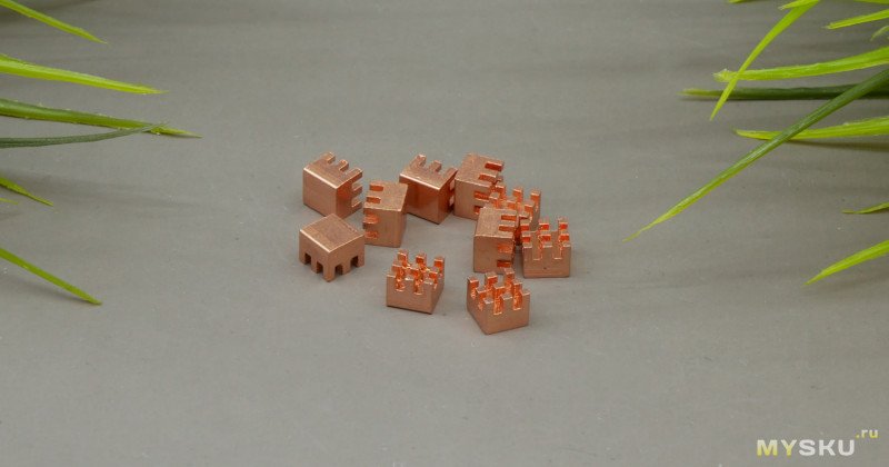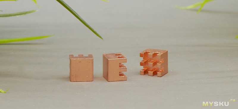 Медные мини-радиаторы выполнены в форме куба с небольшим оребрением. Толщина основания составляет 3 мм, а гребенка позволит воздушному потоку лучше «снимать» тепло.