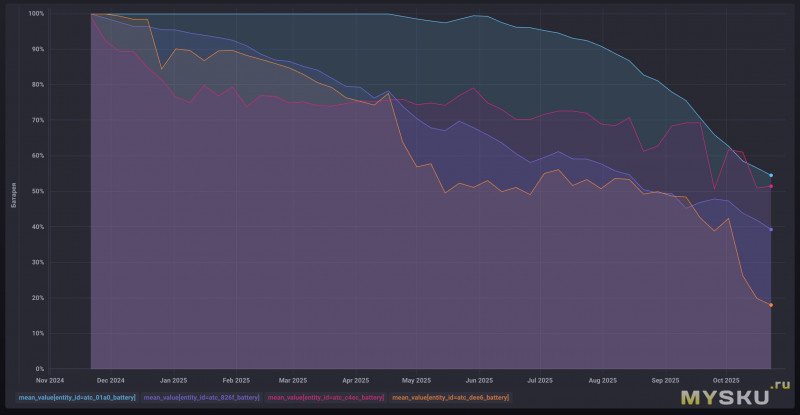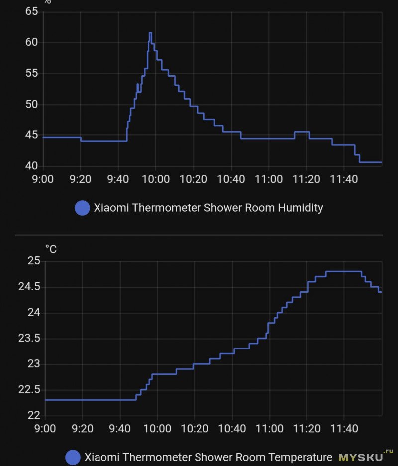 Еще его особенность. Если посмотреть в приложении, то он строит график с измерением 1 раз в час. И я подумал, что так он и меряет, и не подойдет мне для включения вытяжки. Но по факту оказалось, что при превышении уставки по влажности сигнал он передает сразу, и вентилятор включается.