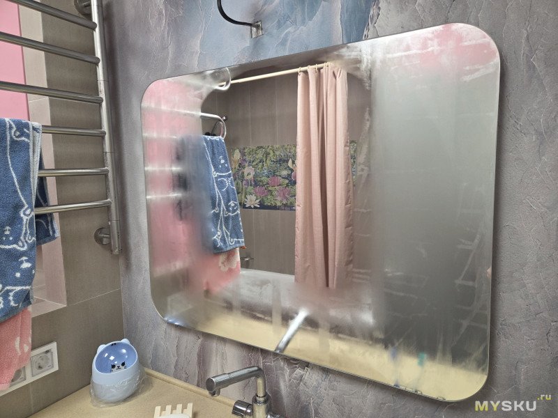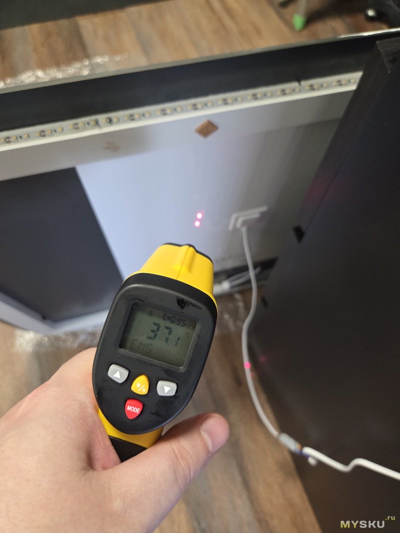 Поверхность зеркала также нагревается до примерно 37 градусов и остаётся такой. Через час работы температура достигла 41 градуса. По мне отличная температура, нет перегрева и нет запотевания.