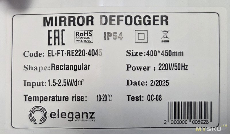 «Антизапотеватель „Eleganz 220в“ для зеркал, 10вт, размер подогрева 400х450мм., IP54 1 шт.»