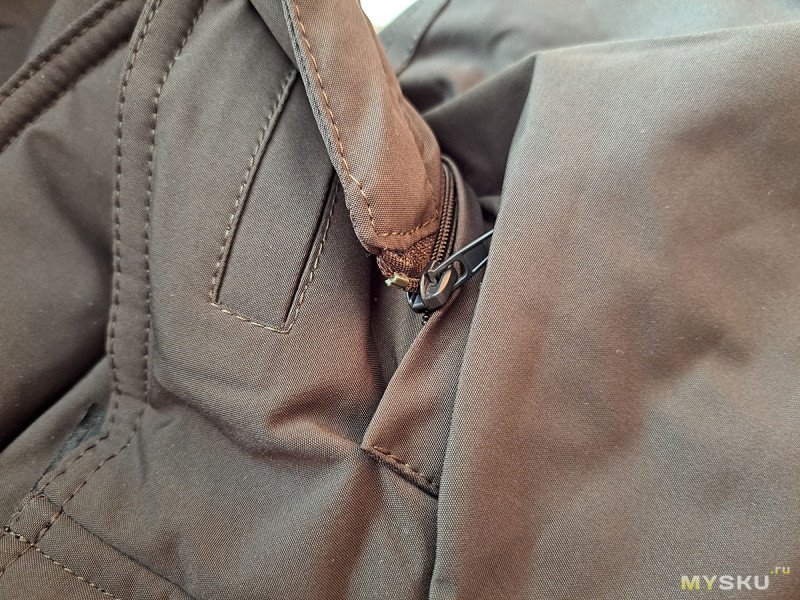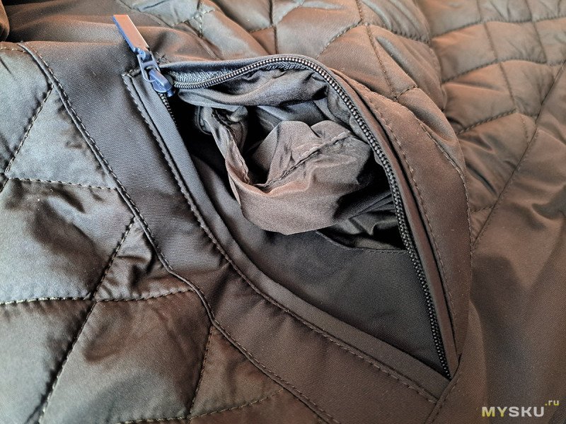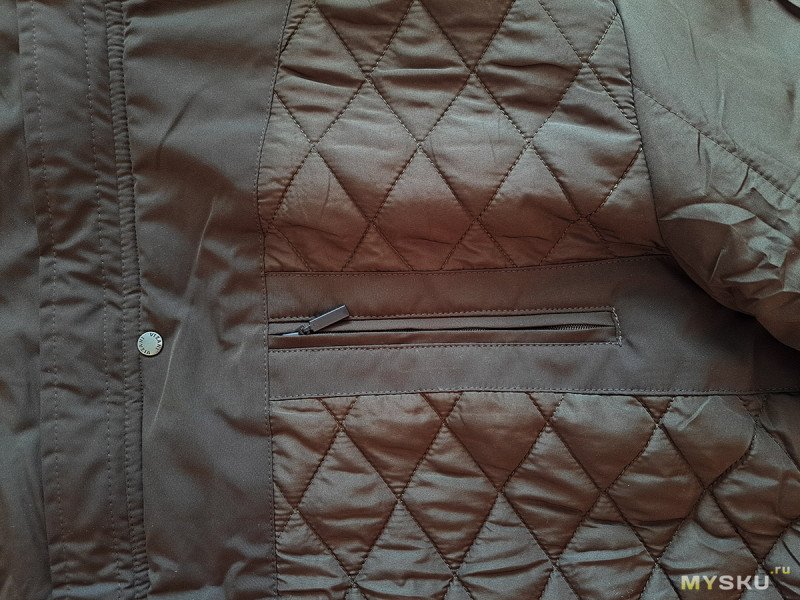У куртки два внутренних кармана. Кстати, на общем плане видно, что они располагаются на немного разной высоте… В обычной жизни это не будет заметно, но говорит о контроле качества на производстве.