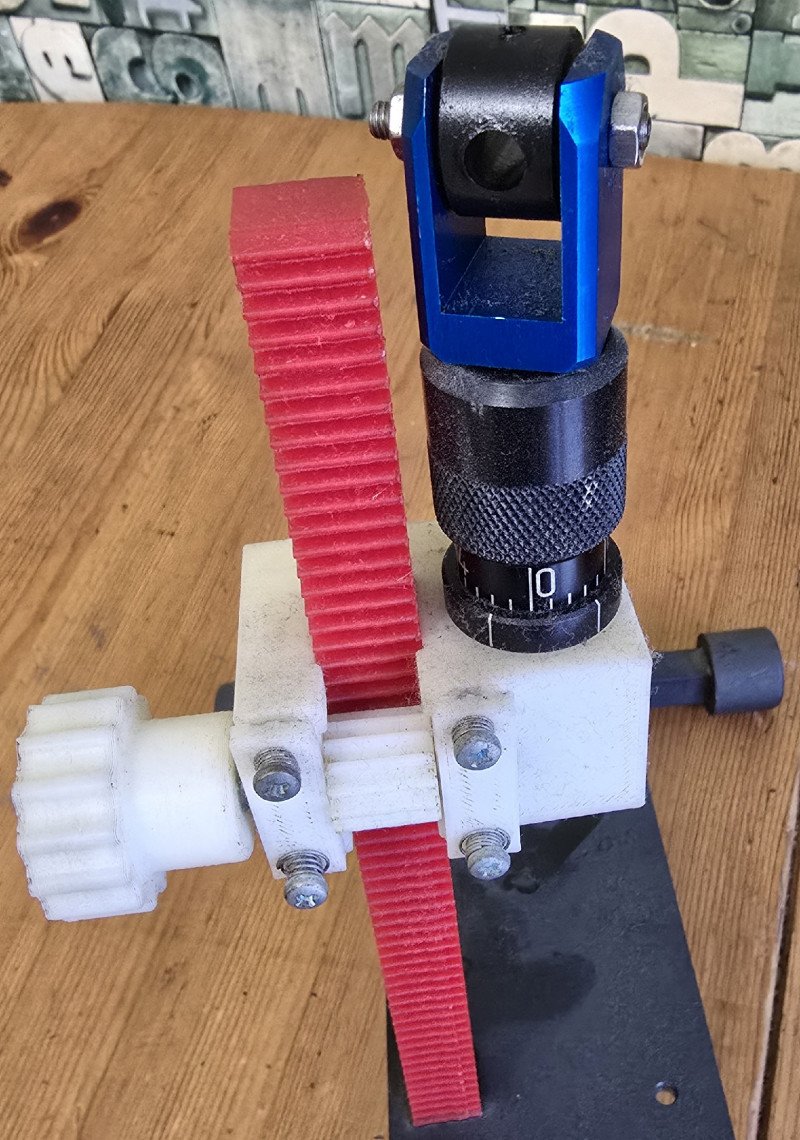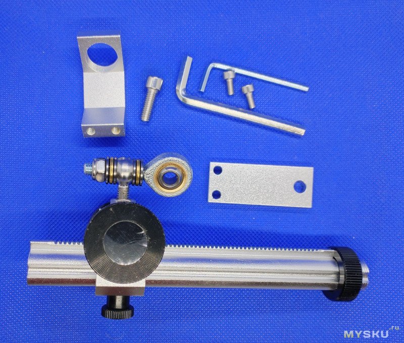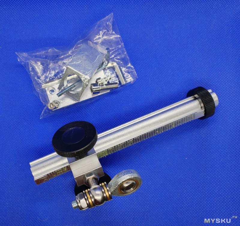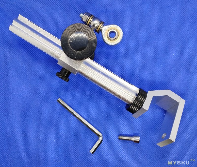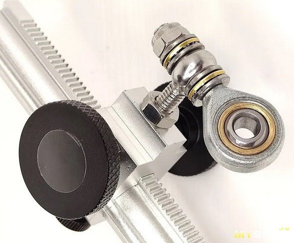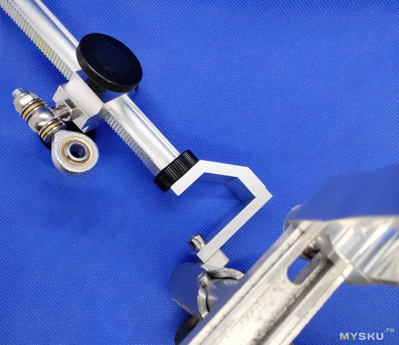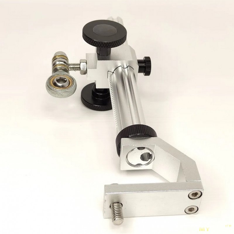 Во-первых, что он делает? С помощью этого механизма выставляется угол заточки. На реечной стойке смонтирован шарнирный механизм удерживающий штангу диаметром 6мм с механизмом крепления бланков.