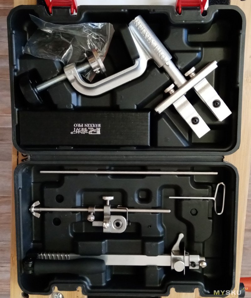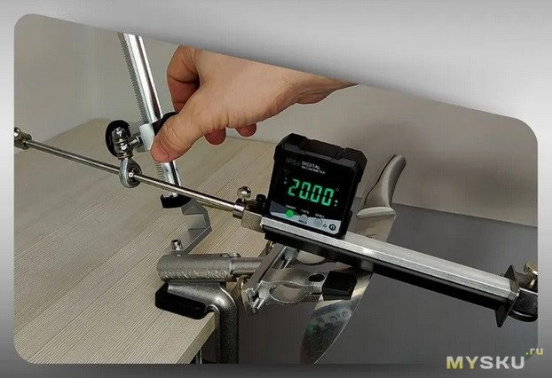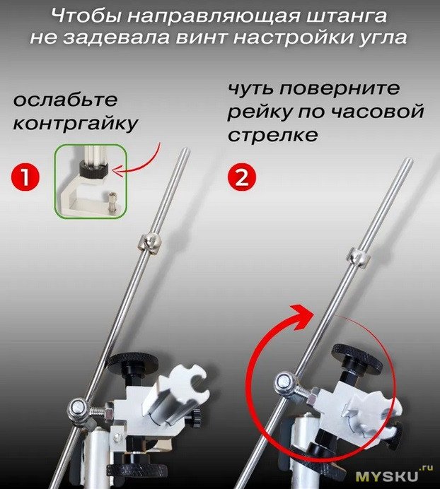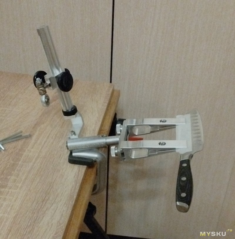 По работе все отлично! Регулировка угла заточки и его выставление происходит мягко, точно с дискретностью сотых градуса. От руки полученный угол фиксируется небольшим винтом. Держит надежно.