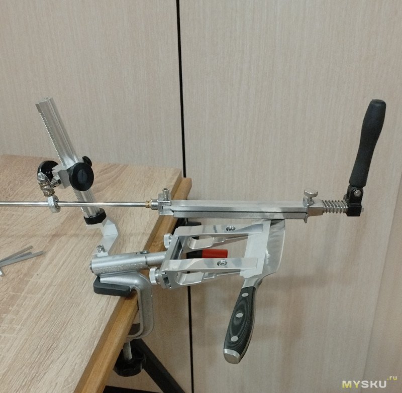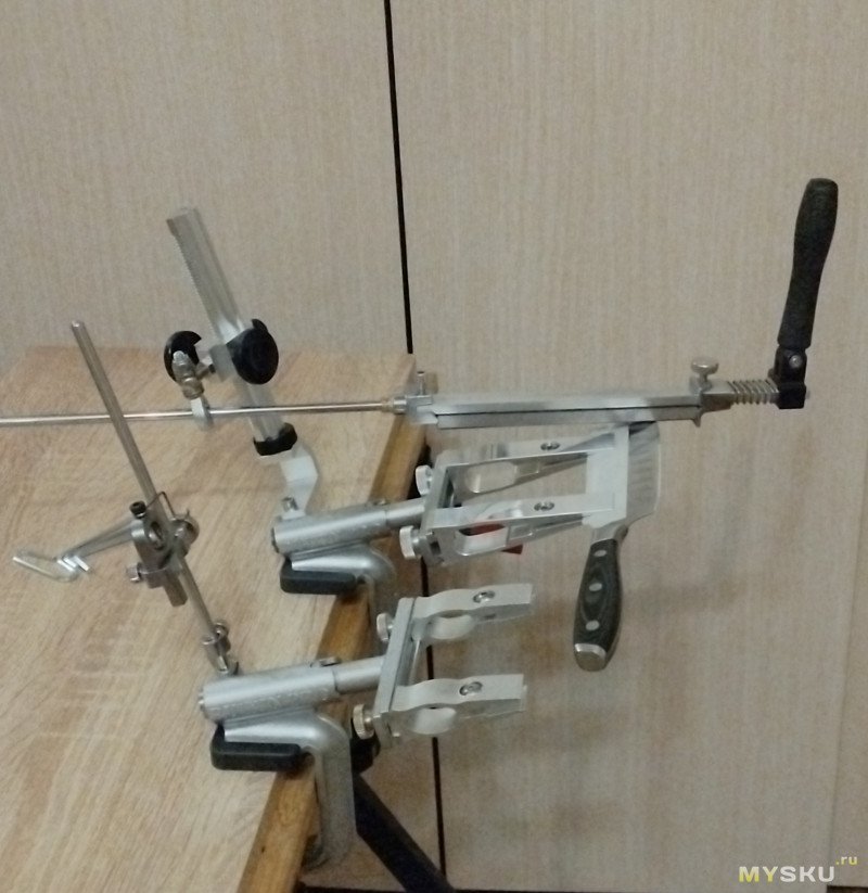 За пару минут механизм собран и готов к работе. Нужно попробовать что-нибудь заточить. Но увы – из всего обилия ножей оказалось, что точить то и нечего: все уже заточено, углы правильные выставлены.