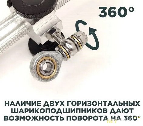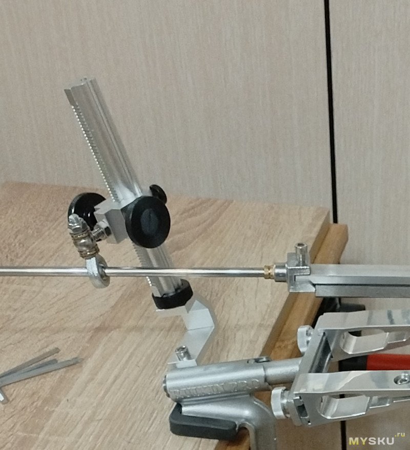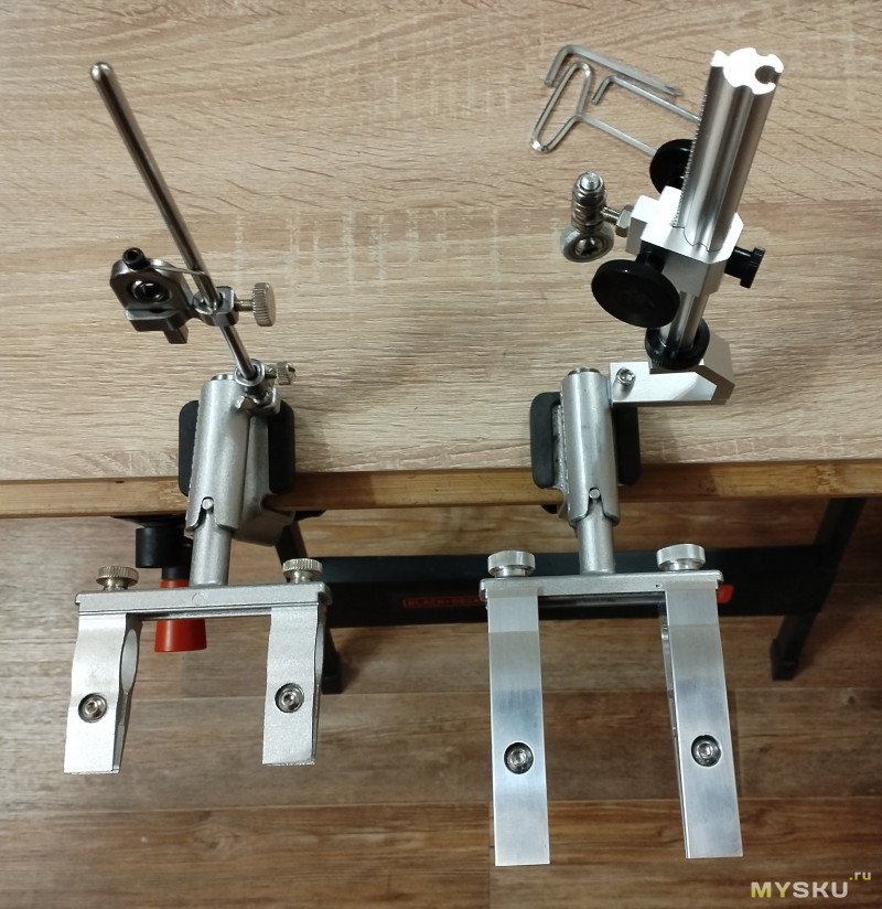 Дополнительным достоинством этой стойки является: наличие двух горизонтальных шарикоподшипников с возможностью поворота на 360 градусов, которые значительно увеличивают горизонтальный угол поворота узла скольжения и позволяют затачивать длинные клинки кухонных ножей до 40см.
