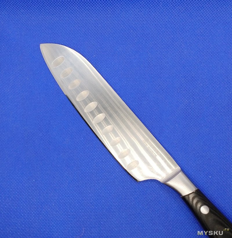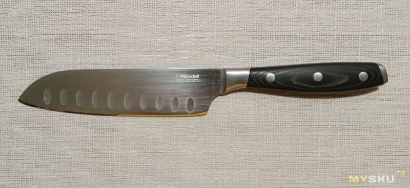 Но нет, нашелся-таки нож неохваченный моим вниманием – это средний сантоку Rondell из серии Falkata, с клинком 14 см и микартой на рукоятке.