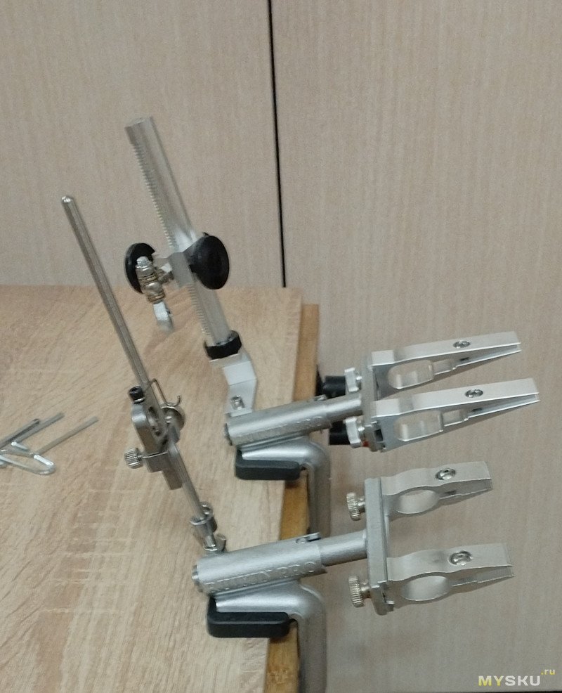 Вполне осознавал, что это супер бюджетный вариант и приходится мириться со многими неудобствами в работе этой системы. Но тешил себя мыслью, что вот куплю Pioner от TSPROF, и все вопросы будут решены. Но инертность и лень так и не привели к покупке. Я больше уделял время и деньги расходникам, выбирал то что мне было нужно.Как промежуточный вариант решил чуть улучшить характеристики одного из элементов системы, для удобства в работе, надежности и расширения диапазонов углов. Это зажимы для клинка.
