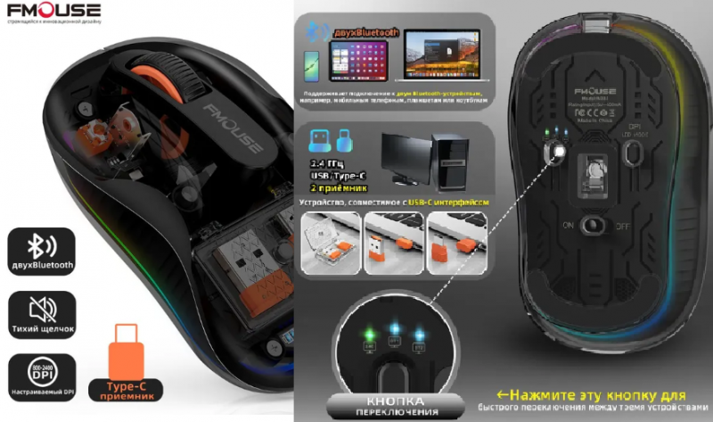 Мышка понравилась своим внешним видом, также работой от аккумулятора, порт Type-C для зарядки, подключение к ПК через USB-ресивер, и еще возможностью подключения к двум устройствам по Bluetooth.