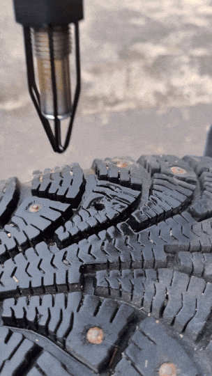 Во-первых, округлые губки из проволоки не всегда раскрывают отверстие так, чтобы шип сел до конца. Слева — шип установлен правильно. Справа — неправильно, корпус шипа выше уровня протектора (хотя глубины отверстия достаточно). В интернетах говорят, что чуть более дорогие варианты дошипуна с пластинами вместо проволоки работают надежней. Еще подобное возникает, если при начале работы губки сведены не до конца или инструмент недостаточно прижат к резине.