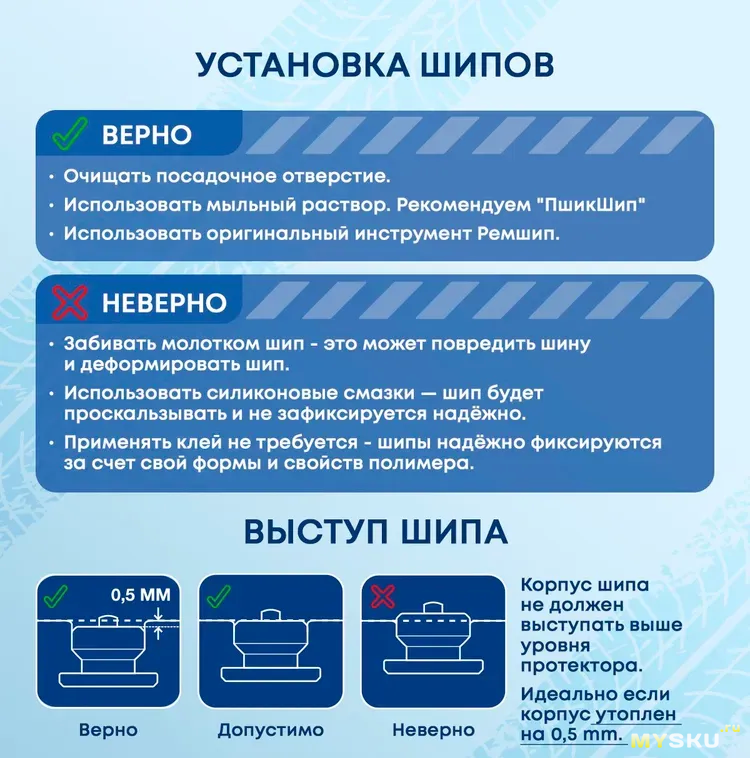 Рекомендации производителя ремонтных шипов по выбору высоты шипов некорректны. При установке шипов по этим рекомендациям, шип торчит над поверхностью резины на 0-0,5 мм и эксперты Авторевю не смогли зафиксировать изменения в характеристиках шин после такой ошиповки.