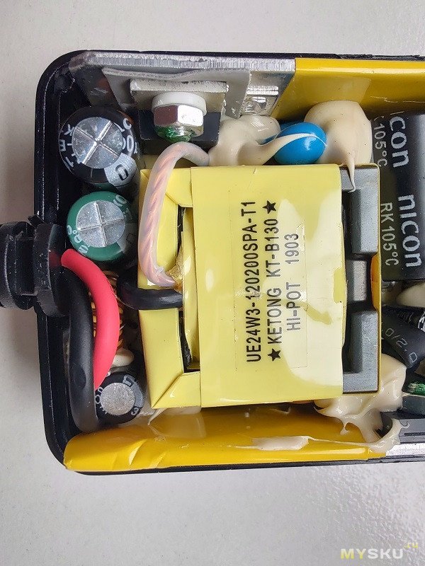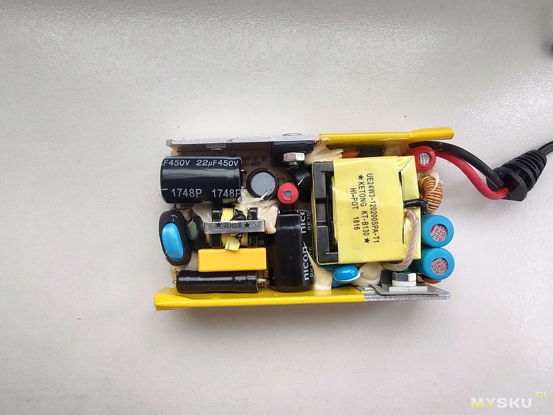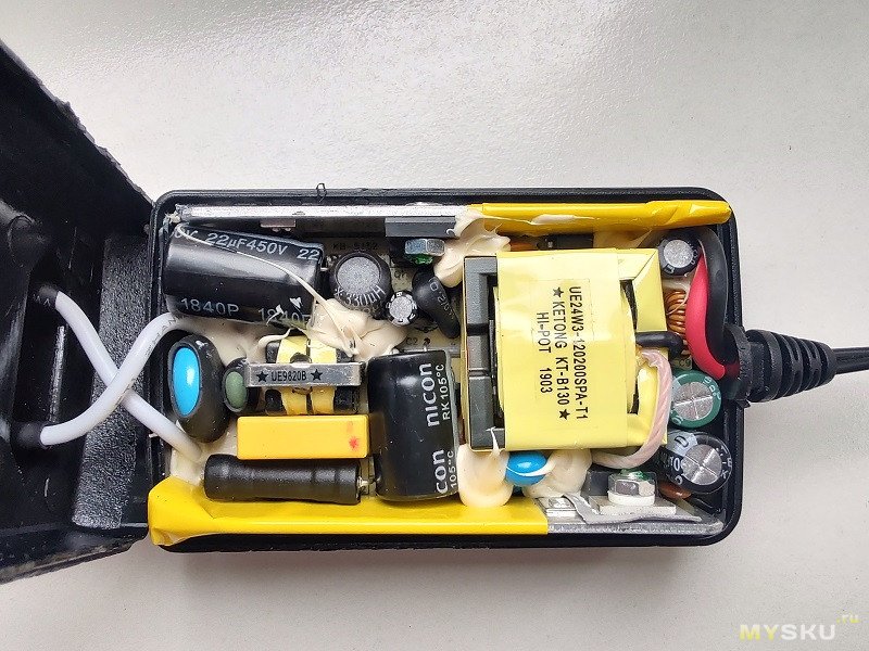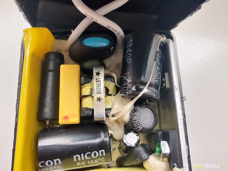 Огромный предохранитель в изоляции, есть герметик, термистор и варистор присутствуют и они в термоусадке, фильтр, большие радиаторы с изоляцией в нужном месте. Соответствующего размера трансформатор (дроссель), нужная ёмкость высоковольтных конденсаторов. Даже надели цветную термоусадку на выходные провода перед кабельным вводом в корпусе.