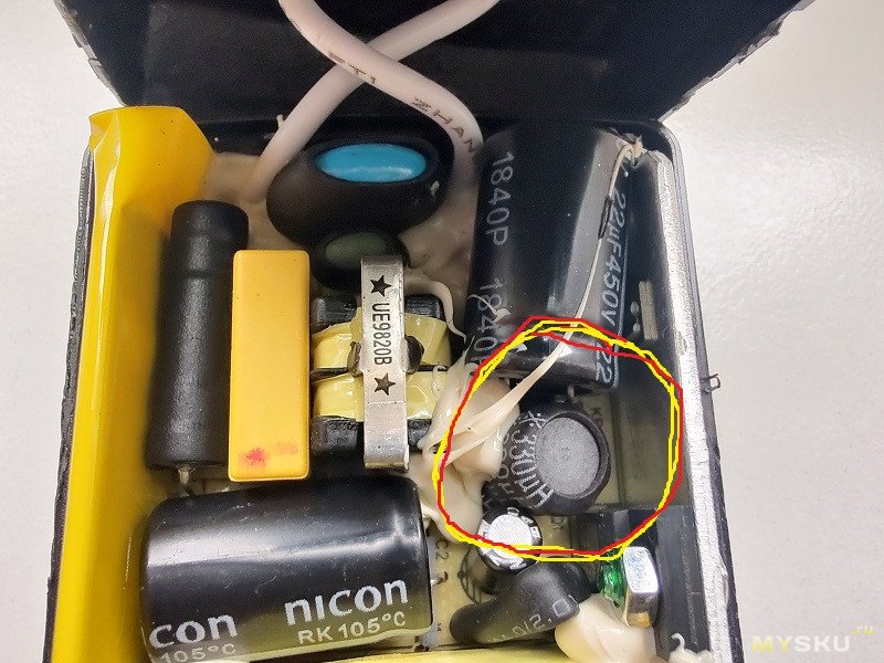 В старых адаптерах был на выходе китайский 16V-1000uF (18 Вт). В адаптере на 25Вт был один брендовый на 16V-1000uF. В новом адаптере на 25Вт — всего один 25V-820uF (Rubycon ZLH). Высоковольтные конденсаторы почти всегда азиатских производителей.