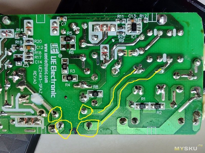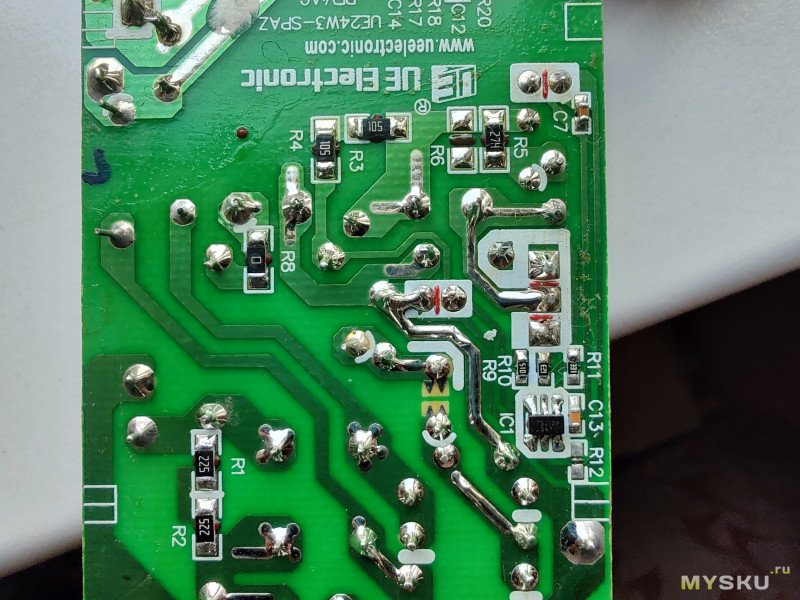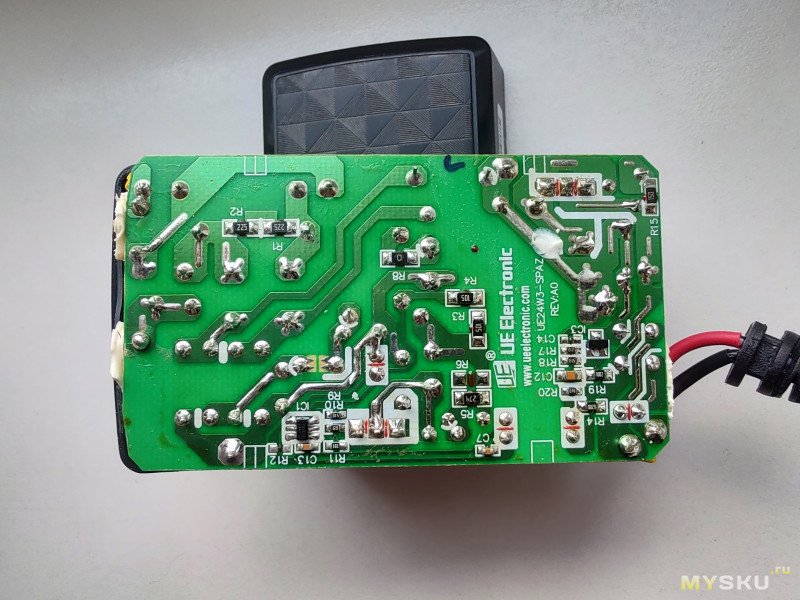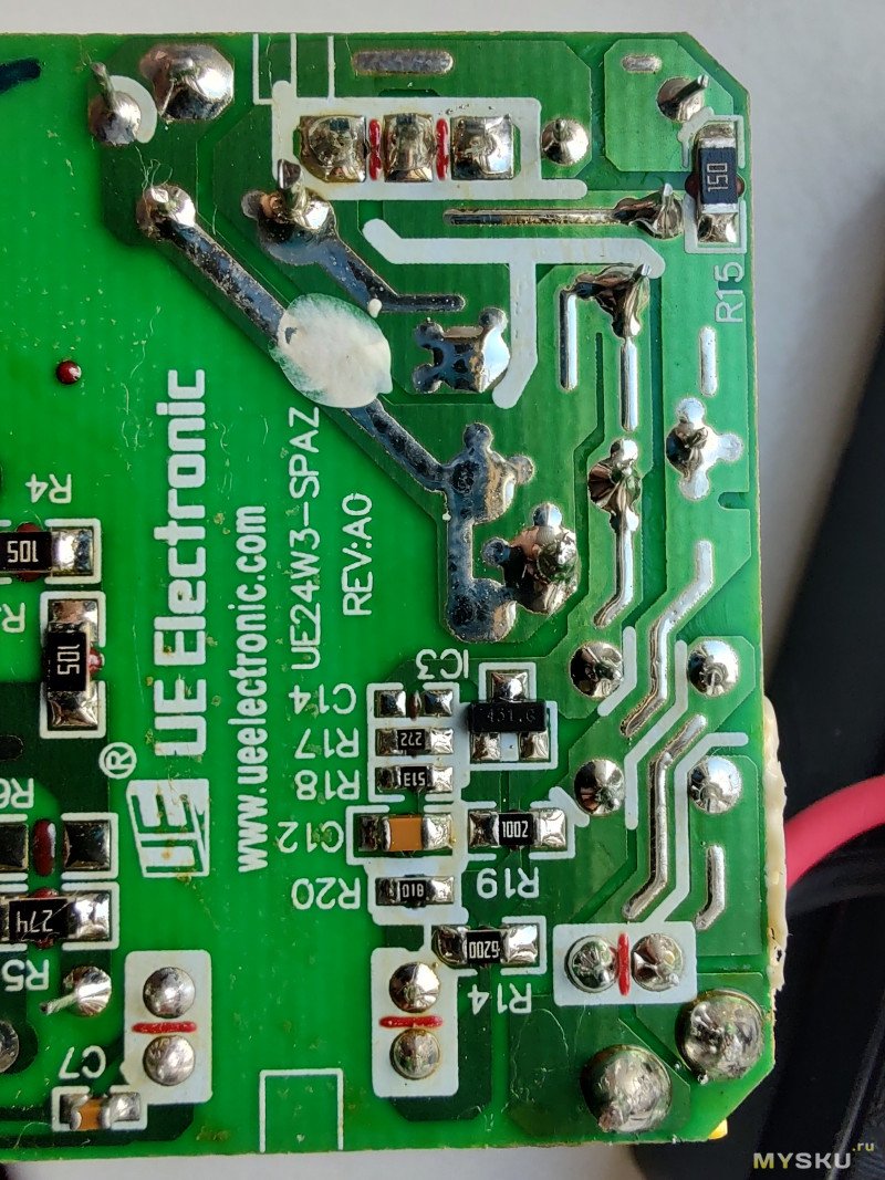Особенность платы — оставлены очень длинные выводы у элементов. Производитель забил их откусывать, там это не требуется. Это снижает шанс появления этих плат на китайском рынке б/у и разбора. В корпусе есть выступы под плату. То есть, сама плата не лежит вплотную на дне корпуса, есть небольшой зазор.