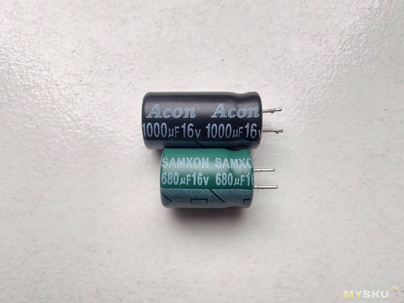 Выходные конденсаторы — основные Acon и Samxon. Один 16V-1000uF и другой 16V-680uF. Затем хороший синфазный дроссель и мелкий 16V-330uF (на 6.3мм).
