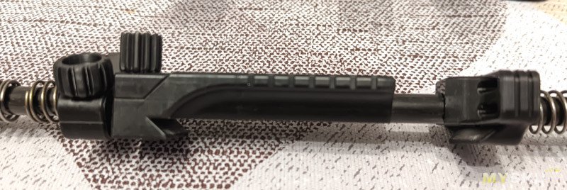 Собрана на двух горизонтальных и двух вертикальных подшипниках. Втулка штока съемная. Реализована парковка сапожок/крючок.