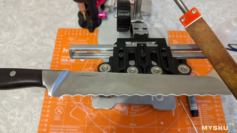 Да, шумная, угол наверняка плавает и вообще не идеален, точильный брусок — с WB за 200р. Но ножи режут, т.е. результат меня устраивает, а сам процесс стал не интересен. Ножи обычные, не по 10-20К за штуку, но хорошие.