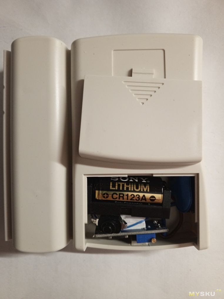 Препарирован. Внешний вид корпуса базового блока. Крепится на 5 саморезах: 4 под наклейкой (один скрыт под надписью RJ11), пятый с обратной стороны корпуса в батарейном отсеке.