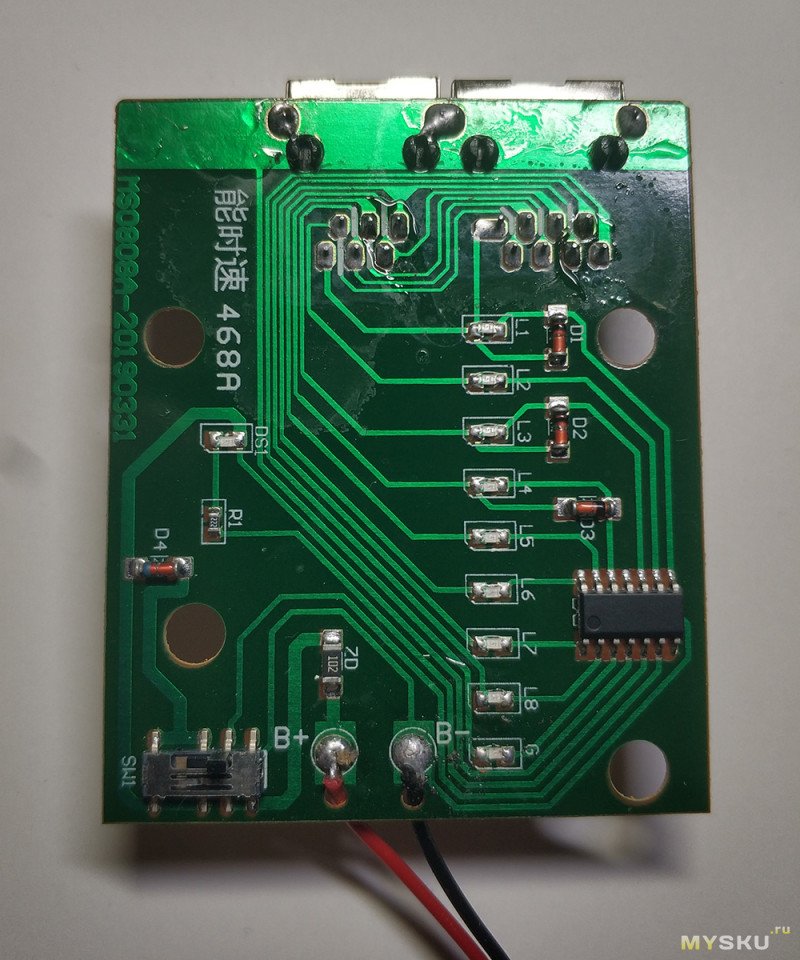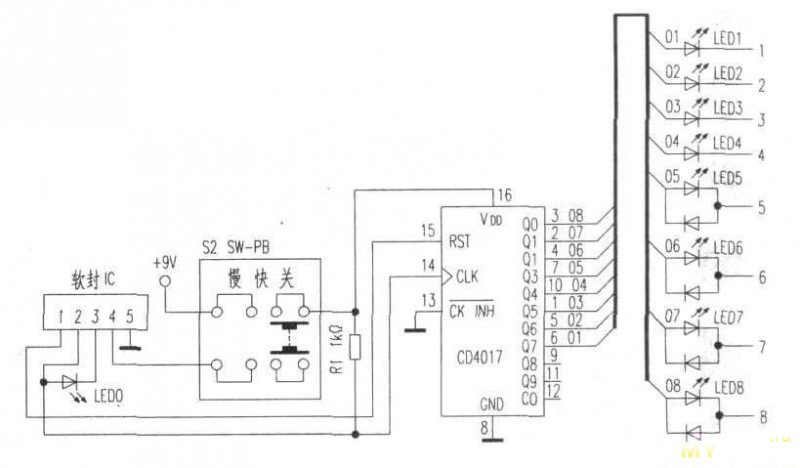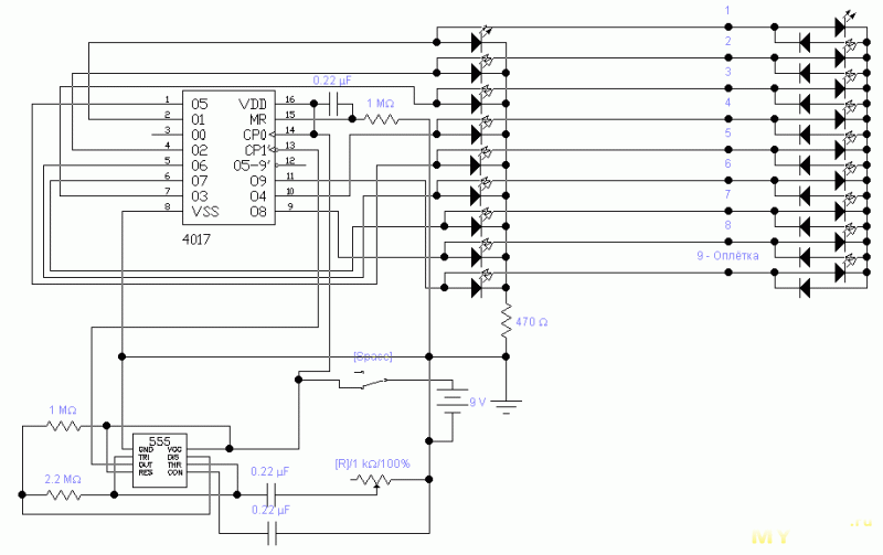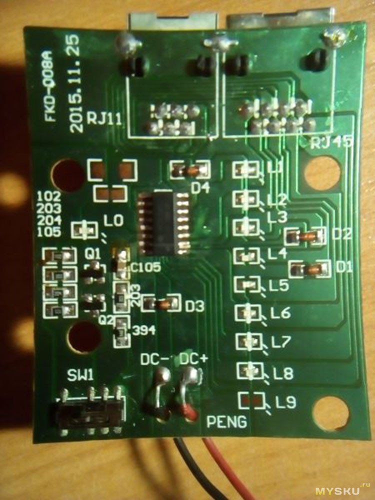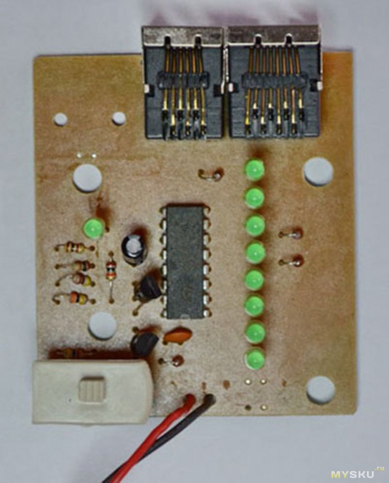 2. Схема упрощена до безобразия, все «слито» в один чип. Чип проприетарный, следовательно прибор одноразовый, ремонту и восстановлению не подлежит в случае выхода чипа из строя. Встречал сообщения, что аналогичными тестерами (на 4017 логике) пробовали тестировать кабель с КЗ по линиям => тестер уходил к праотцам.