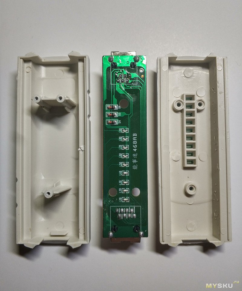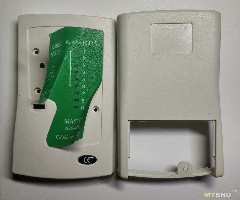 1. В угоду экономии и, видимо, для упрощения производства изменен корпус. В отличие от корпуса аналогичного тестера обозреваемый собран из 3х частей: 2е половинки корпуса и крышка батарейного отсека. Саморезы расположены под наклейками, что вызывает некоторые трудности с доступом к ним. Кроме того, наклейка, можно сказать, одноразовая. Если вы ее один раз оторвете, то держаться она больше нормально не будет, будет отклеиваться. Потому, как рекомендация для желающих разобрать — скальпелем аккуратно вырезать отверстия в местах нахождения колодцев под саморезы.