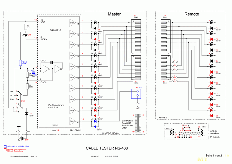 3. Особенность схемотехники не позволяет проверить кабели различных нестандартных расключений. Об этом сообщал Рейнхард, указывая, что схема имеет только три обратных диода на основной плате и плате ответного модуля, которые создают «токовую петлю» для одной пары проводников. Как вариант решения данной проблемы предлагается напайка дополнительных диодов в целях тестирования нестандартных кабелей.