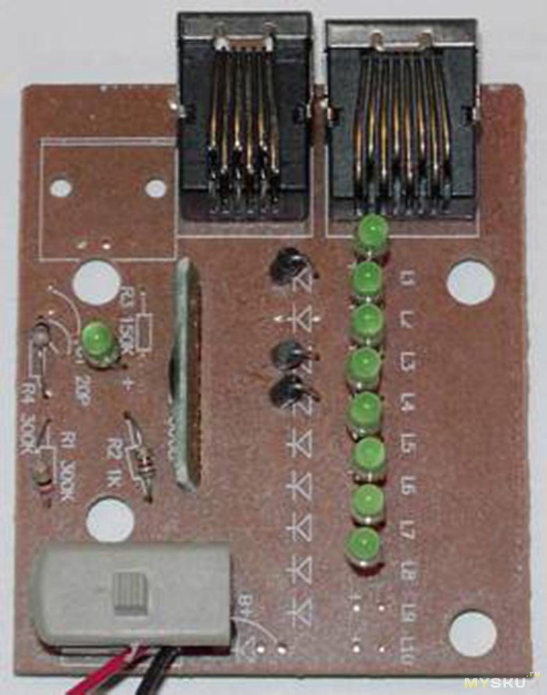 Тестер питается от стандартной кроны (9 Вольт), но, поскольку в наличии такого добра не имелось, тестер был запитан от ЛБП. Тест проводился на 2 метровом патчкорде: в диапазоне 7-9 Вольт у тестера стабильная индикация, также как и при поднятии до 12 вольт (дальше уже не рискнул), а вот при 6 вольтах индикация уже очень слабая. Это на случай, если кто туда запланирует литий ставить.