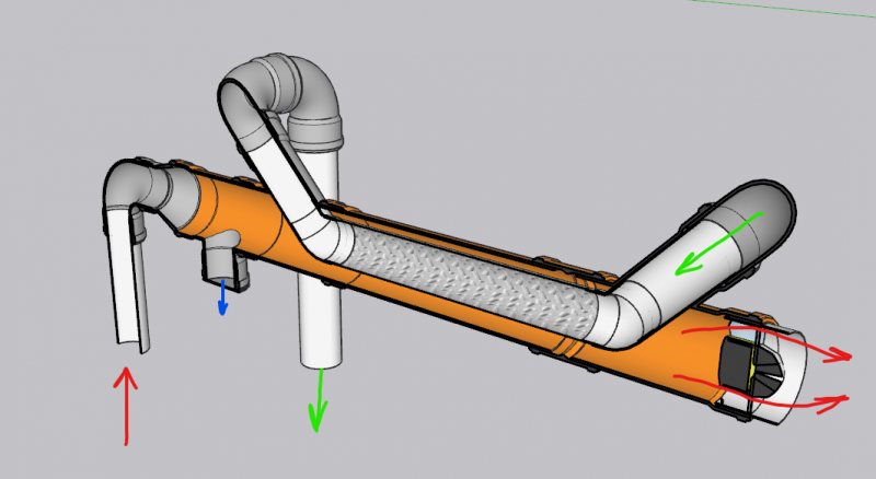На входе в первую зиму собрал простой, понятный и, как мне тогда казалось, самый эффективный вариант — коаксиального типа, труба в трубе, встречно направленные потоки входящего и выходящего воздуха, почти на всю длину чердака — 9 метров, чтобы точно хватило))