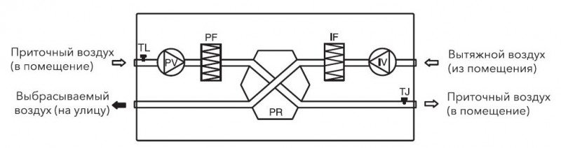 Цифрами помечены:1 — ввод чистого воздуха с улицы,