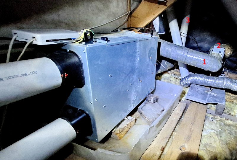 Нас было четверо, пополнения не предвиделось, площади на каждого приходилось сильно больше 20 м^2, воздуховоды почти до всех точек укладывались в длины 5-7м, и я счёл, что в среднем нам её будет достаточно — ещё и с учётом отдельных периодически включаемых мощных вытяжек на кухне и в главном санузле.Установка умеет отключаться на оттайку при обмерзании и включать преднагрев входящего воздуха при его температуре ниже -15С, для этого требуется внешний нагреватель и реле, и я их даже смонтировал, но так и не подключил. Оказалось, что не так страшны у нас минуса, и режима оттайки вполне достаточно даже в самые морозы.