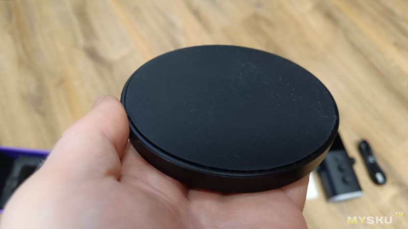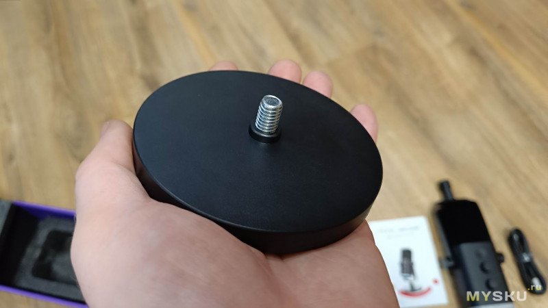 Подставка довольно таки тяжёлая - 200 грамм. По центру расположено резьбовое крепление под микрофон. Снизу прорезиненная антискользящая накладка.