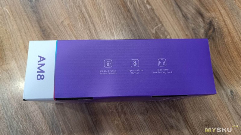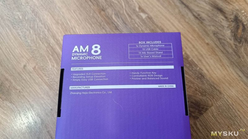 Поставляется микрофон в яркой, красочно оформленной коробке. С обратной стороны которой указаны краткие технические данные, а по бокам ключевые особенности устройства.