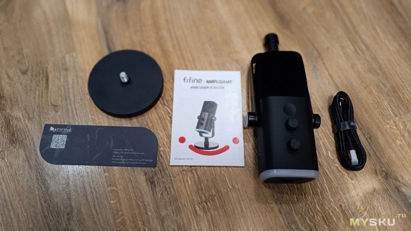 В комплект поставки входят следующие компоненты: непосредственно сам микрофон, настольная подставка, USB-кабель, поролоновая ветрозащита, руководство пользователя и гарантийный талон.