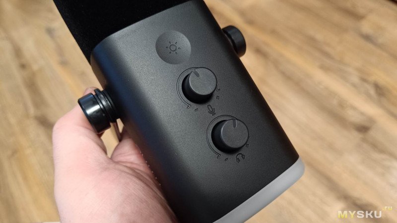 Органы управления расположены на передней или задней стороне корпуса (в зависимости от того, как будет установлен микрофон). Это два поворотных регулятора. Верхний отвечает за усиление уровня записи звука, нижний — за громкость в подключенных наушниках. Здесь же расположена сенсорная кнопка управления RGB подсветкой.