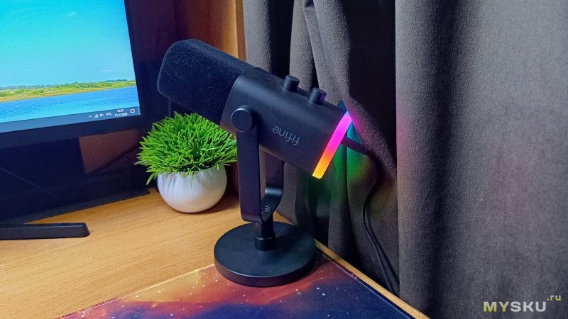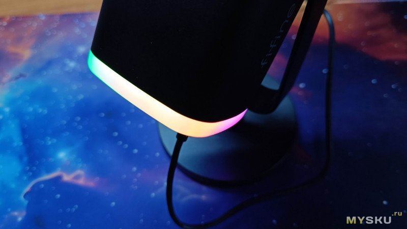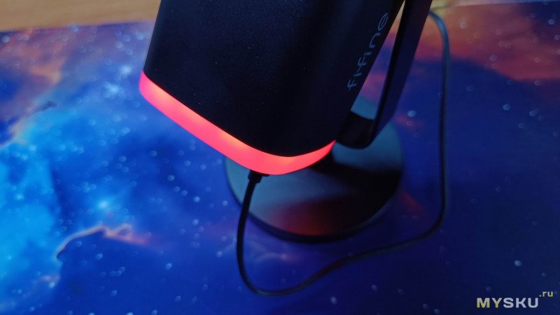 Выглядит Fifine AM8, как говорится модно, стильно, молодёжно. Дизайн хоть и простой, без излишеств, но приятный, позволяющий ему легко вписаться в любое рабочее или игровое пространство. Если RGB-подсветка раздражает, то её всегда можно отключить.