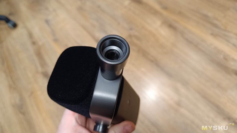 Это крепление оснащено стандартной резьбой 3/8 дюйма для установки на комплектную настольную подставку. А также второй резьбой большей размерности 5/8 дюйма для установки на микрофонную стойку (пантограф).