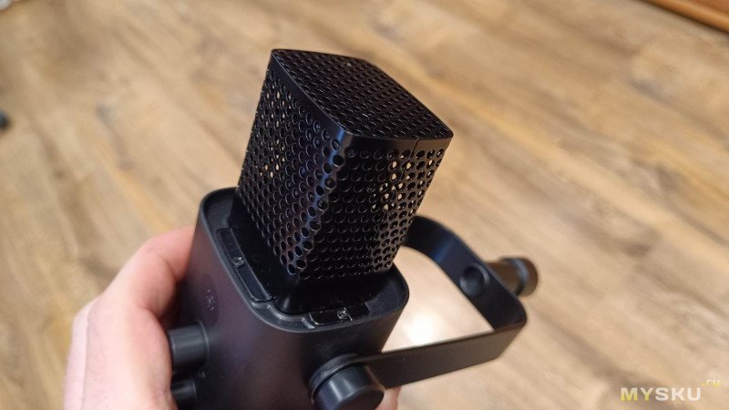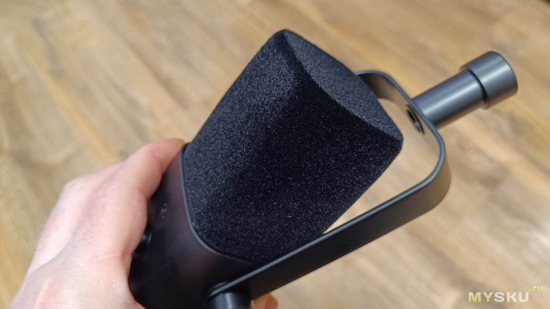 В верхней части корпуса установлена плотная поролоновая ветрозащита. Она довольно быстро собирает на себе частички пыли. Под ней находится защитная сетка (гриль), закрывающая капсюль микрофона.