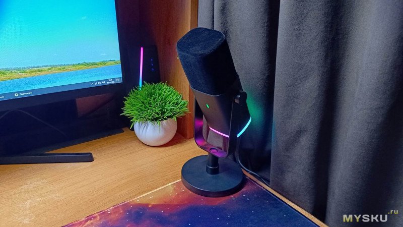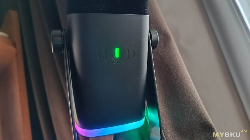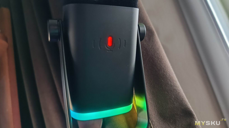 Микрофон в нижней части корпуса имеет матовый плафон по периметру с RGB-подсветкой. Она управляется сенсорной кнопкой на корпусе и имеет несколько режимов работы (включая градиентные переливы и статические цвета).