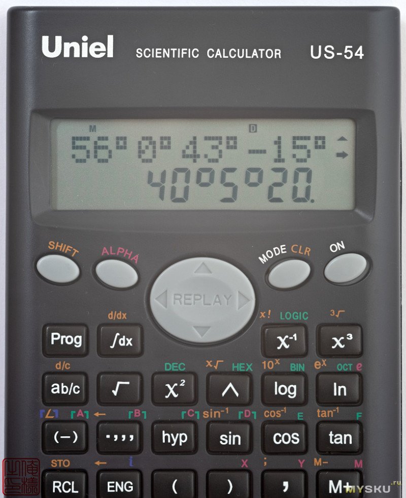 Впечатляет и возможность работать с угловыми мерами, представленными в градусах, минутах и секундах дуги. Допустим, мне понадобилось посчитать разность широт между Красноярском и Паттайей. Широта первого города – 56°00′43″, второго – 15°55′23″. Есть несколько способов сделать это с помощью обычного калькулятора, однако удобными их не назовёшь. А вот на Uniel US-54 для ввода углов в таком виде имеется специальная кнопка «° ❜ ❞», которую нужно нажимать после ввода градусов, минут и секунд. В нашем случае надо набрать