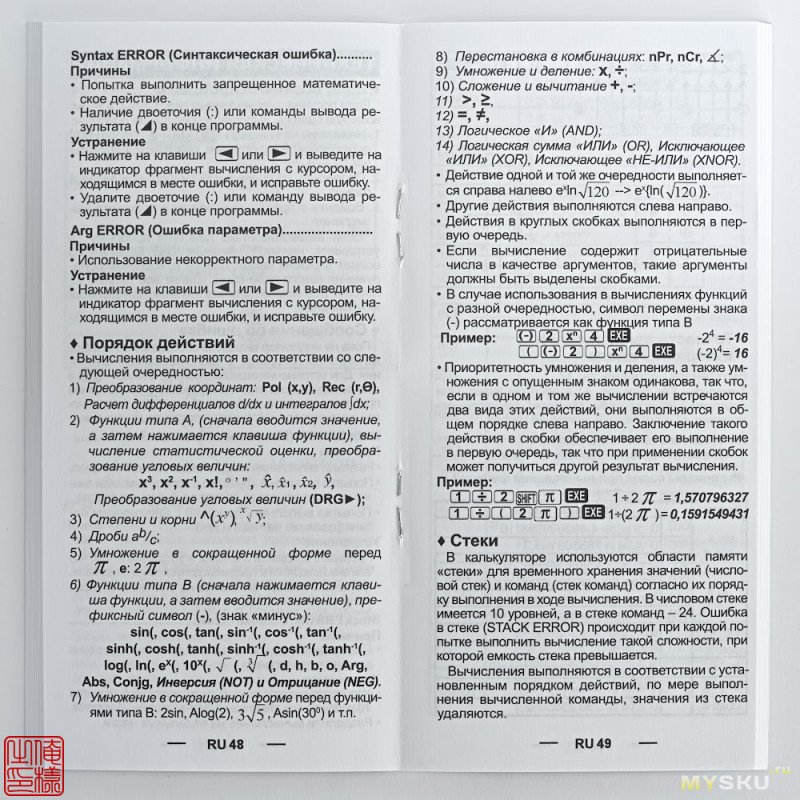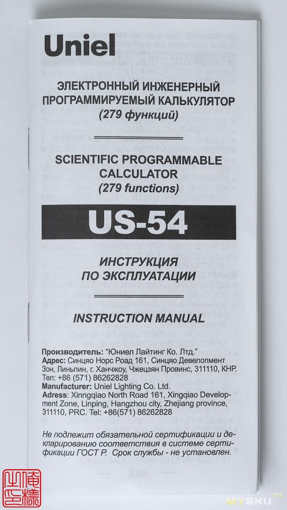 Кстати, об инструкции. Инструкция в коробке с калькулятором есть, занимает аж 96 листов и напечатана на двух языках, причём русскоязычная часть написана нормативным языком, не осквернённым гуглопереводом. Текст, в целом, достаточно подробен, чтобы разобраться во всех аспектах применения калькулятора, от арифметики до статистических расчётов. А ещё на первой же странице инструкции присутствует информация об изготовителе, и тут всё немного предсказуемо: калькулятор произведён в Китае.