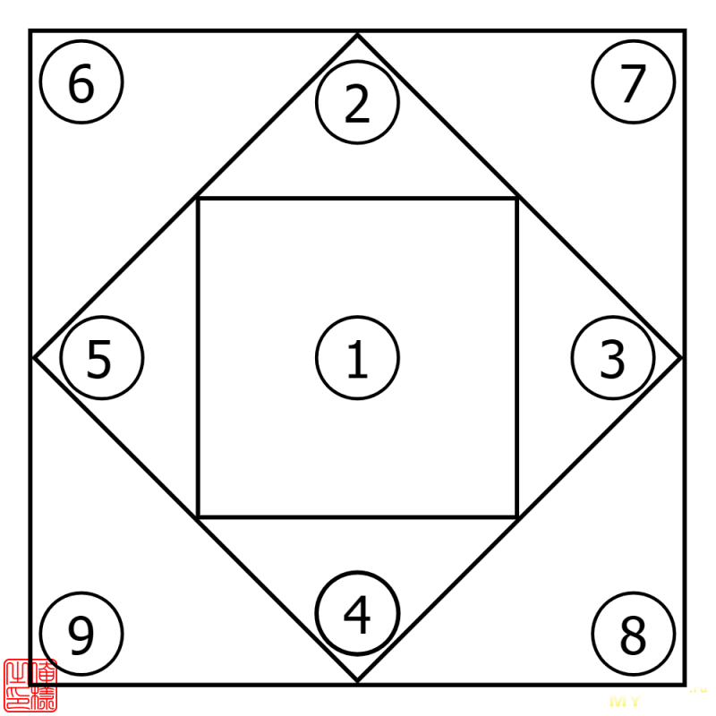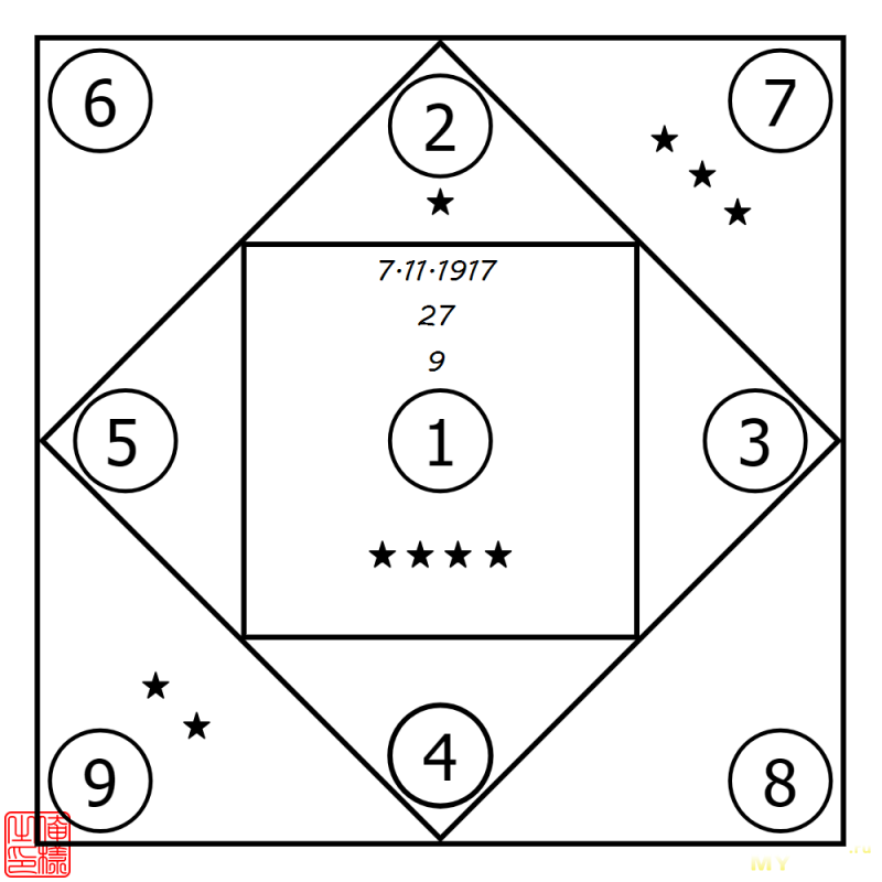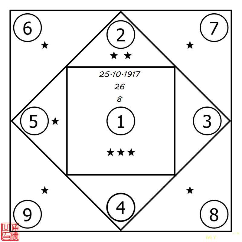 В качестве исходных данных для расчёта возьмём дату 25.10.1917. Перво-наперво необходимо изобразить антуражный квадрат и пронумеровать его ячейки цифрами от одного до девяти.