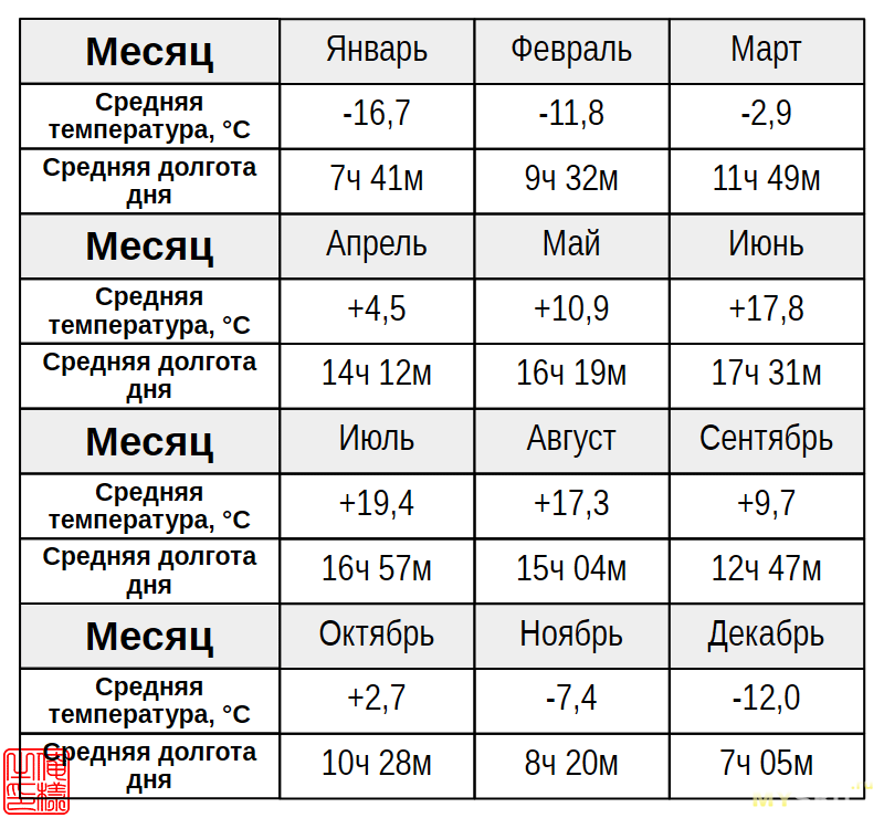 За статистикой придётся прогуляться в интернет. Данные по среднемесячным температурам в Красноярске за последние 10 лет я взял с http://www.pogodaiklimat.ru/history/29570.htm, продолжительность дня – с https://timewek.ru/citysun.php?sID=24. Усреднив и то, и другое, я свёл результаты в следующую табличку: