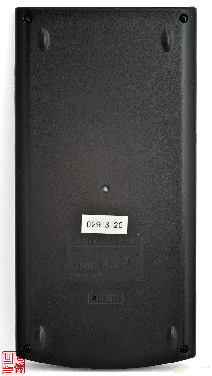 Также на тыльной стороне калькулятора присутствует логотип производителя, надпись «Made in China», бумажная наклейка с числами неизвестного смысла и назначения и небольшое отверстие с подписью «RESET», в глубине которого скрывается кнопка. Нажимать на неё нужно, если калькулятор наглухо «завис» (мне такого добиться пока не удавалось) либо сразу после замены батареек.