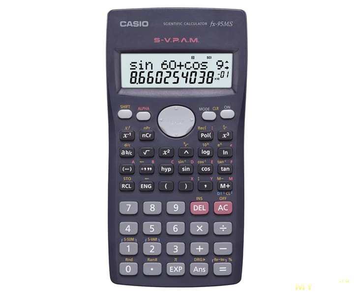 По примеру из предыдущего абзаца можно заметить, что тригонометрические функции здесь вводятся не так, как на «обычных» калькуляторах. Например, вычисление синуса 30° на большинстве калькуляторов выглядит так: набираем «30», нажимаем кнопку «sin» и получаем ответ. На Uniel US-54 нужно сначала нажать «sin», потом ввести число 30 и, наконец, нажать «EXE», чтобы в нижней строке появился результат. При этом в верхней строке вы будете видеть выражение, которое вы только что посчитали.