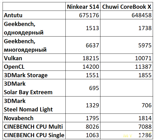 Ноутбуки Ninkear и Chuwi похожи только внешне. По производительности преимущество у обозреваемого, во многом из-за большего TPD в 25W, чем 15W у сравниваемого. В таблице свел результаты тестов, которые можно было провести на обоих.