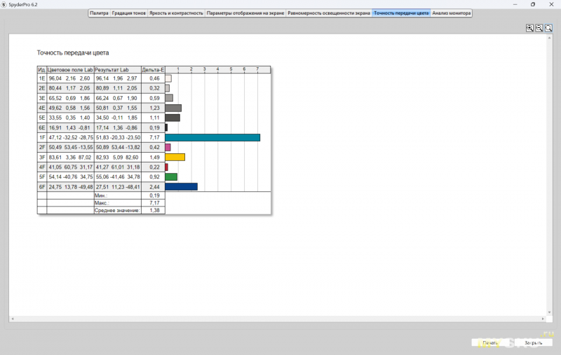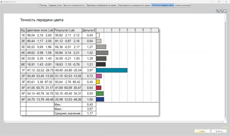 Среднее отклонение по цветам получилось в 1,17, минимальное — 0,45 и максимальное — 3,97. У сравниваемого ноутбука цифры следующие — 1,38, 0,19 и 7,38, соответственно.